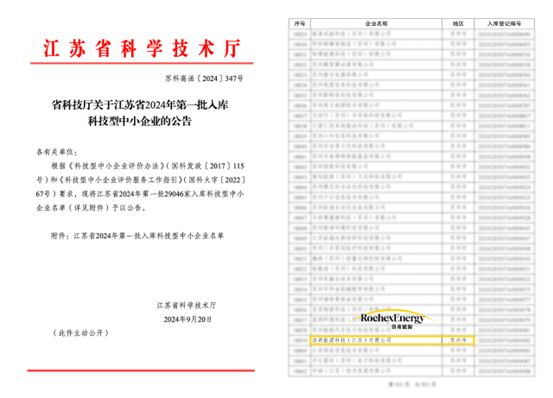 The Jiangsu Provincial Department of Science and Technology recently announced the first batch of national technology-based SMEs for 2024. Roche Energy’s remarkable technological innovation capabilities earned it a spot on the list. Since its inception, Roche Energy has continued to increase R&D investment, actively driving technological innovation and securing numerous invention and utility model patents.